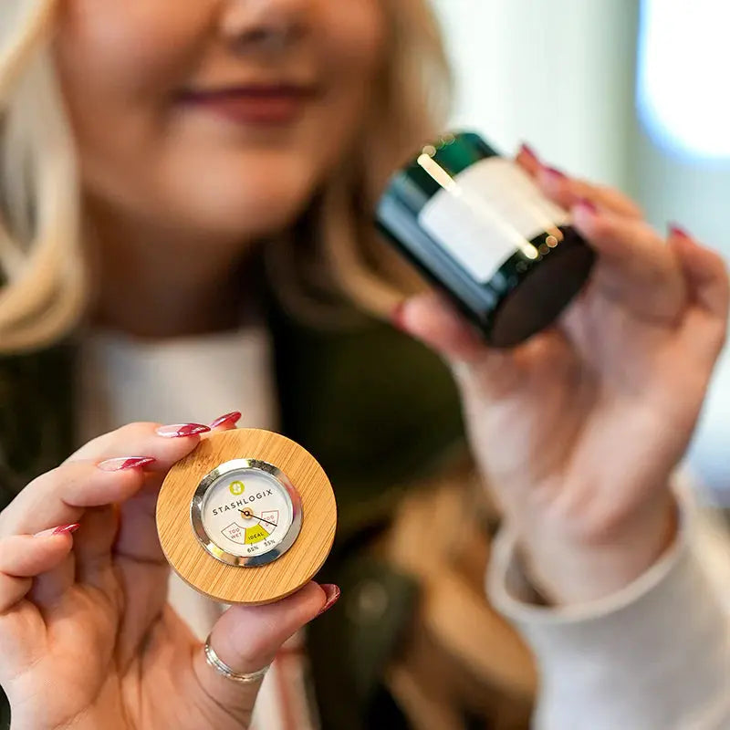 Keep your herbs fresh, fragrant, and perfectly preserved with the Bamboo SmartJar—a premium glass jar with a sustainable bamboo lid and built-in humidity sensor. Designed for optimal freshness, this jar maintains the ideal humidity level to enhance longevity, aroma, and potency.